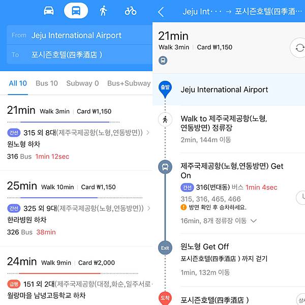 存好屬於自己的旅行地圖後,到了濟州島即可開始使用,以上圖為例,起點站找出事先存好的濟州國際機場,終點站則是濟州四季酒店,輸入後會自動列出所有「當下適合」的交通方案(會依照時間不同、公車班次有所變化),越上面花費時間越短。